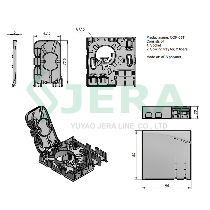 This FTTH Fiber wall outlet ODP-05T with a size of 80*80*20mm is designed for splicing and terminating indoor SC/LC optical cables and pigtails. This wall outlet socket panel can be installed using 1 SC simplex adapter or 1 pigtailed duplex LC adapter. The wall-mounted fiber socket faceplate is made of ABS plastic and has a beautiful appearance. It is suitable for FTTH, FTTO, FTTD, etc. and is convenient for indoor use.